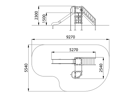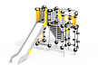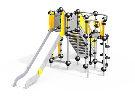 Универсальный комплекс состоит из гимнастического оборудования и двух башен с площадками. Одна башня с ручками, канатами со ступеньками и сеткой, вторая башня с ограждениями, горкой, лестницей, ступеньками и стенкой с лазом. Все металлические элементы башен и гимнастического оборудования выполнены из стали с оцинкованным покрытием, с антивандальными и безопасными соединениями между собой. Оцинковка металла производится методом электрохимической гальванизации. Скат горки выпонен из нержавеющей стали. Площадки, стенки, ручки, лестница, борта и ограждения горки выполнены из HPL пластика. Сетки и канаты изготовлены из многожильного армированного износостойкого каната.