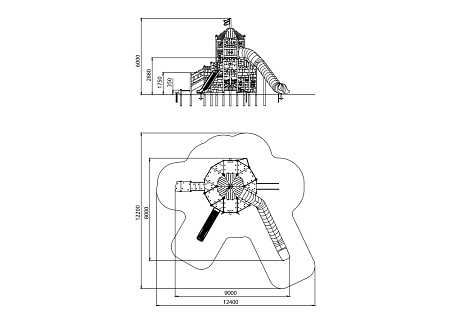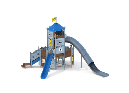 Комплекс стилизован в виде замка с горками и с гимнастическими элементами. В центре комплекса расположена главная шестиугольная башня с крышей и горкой из нержавеющей стали. Вокруг центральной башни расположены площадки, которые обеспечивают ступенчатый подъем на главную башню. По периметру комплекса расположены горка пластиковая, трап-лестница для подъема, шест вертикальный, параллельные полозья для скатывания. В нижней части центральной башни располагается сетка из каната. Все металлические элементы выполнены из стали с оцинкованным покрытием. Оцинковка металла производится методом электрохимической гальванизации. Сетки и канаты изготовлены из многожильного армированного износостойкого каната. Ограждения выполнены из HPL пластика.