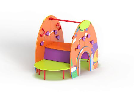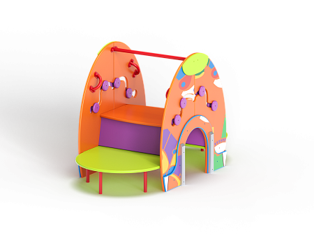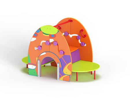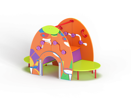 Лазелка состоит из двух боковых стенок с художественным оформлением в стиле граффити, с отфрезерованными глухими и сквозными пазами. В глухие пазы вставляются фанерные элементы в виде трех ступенек и двух стенок. В сквозные пазы вставлены передвижные развивающие элементы. С внешней стороны на боковые стенки крепятся декоративные фанерные накладки. С внутренней стороны крепятся ручки и перекладина.