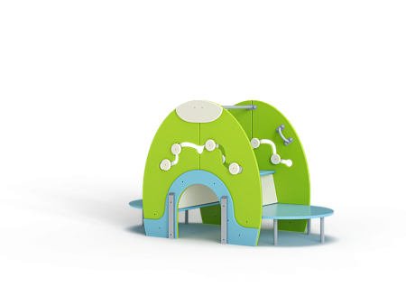Лазелка состоит из двух боковых стенок с отфрезерованными глухими и сквозными пазами. В глухие пазы вставляются фанерные элементы в виде трех ступенек и двух стенок. В сквозные пазы вставлены передвижные развивающие элементы. С внешней стороны на боковые стенки крепятся декоративные фанерные накладки. С внутренней стороны крепятся ручки и перекладина.
