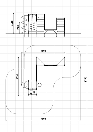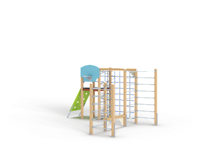 Спортивный комплекс состоит из башни на которой установлены наклонная альпинистская стенка, перекладина с канатом, шест спираль, перекладины, баскетбольный щит с кольцом и ручки вспомогательные. Сбоку от комплекса установлены две угловых шведских стенки соединенных между собой бум бревном. Стенки соединены с башней вертикальной полипропиленовой сеткой.
