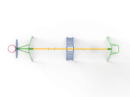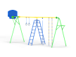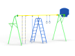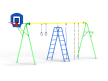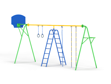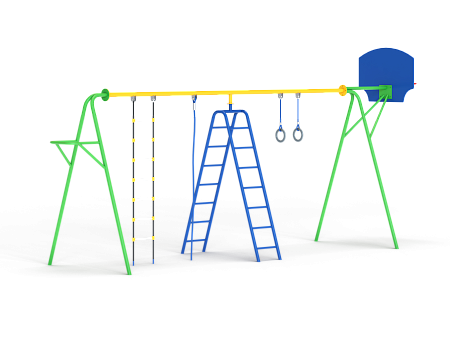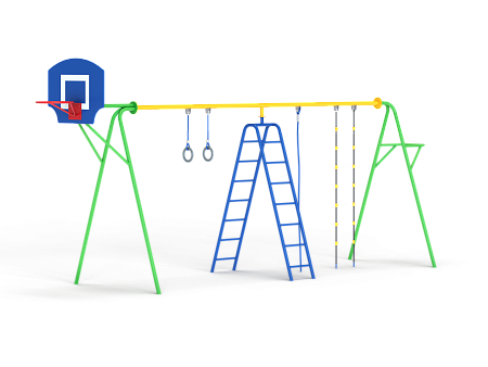 Спортивный комплекс выполнен из металлического каркаса состоящего из четырех частей: двух боковых стоек, одной центральной в форме Л-образной лестницы и перекладины. На одной боковой стойке расположен турник, на второй баскетбольный щит с кольцом. На перекладине установлены навесные элементы: лестница полипропиленовая, канат и кольца гимнастические.