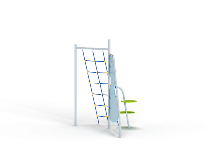 Спортивный комплекс состоит из сборного металлокаркаса к которому крепятся фанерная стенка с альпинистскими камнями, две фанерные круглые ступени и сетка полипропиленовая наклонная