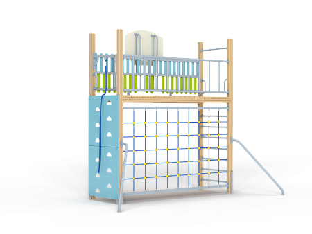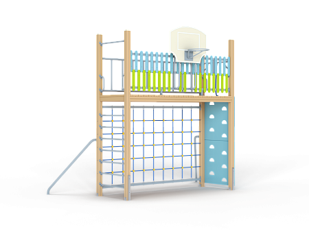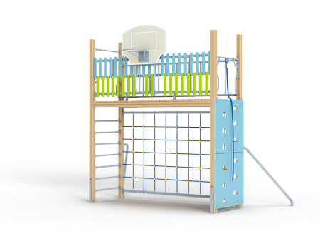 Спортивный комплекс оборудован шведской стенкой, стойками опорными гнутыми, альпинисткой стенкой, рачками вспомогательными, площадкой из бруса, ограждением металлическим и баскетбольным щитом с кольцом .