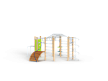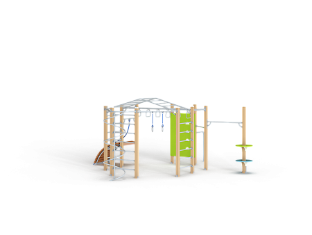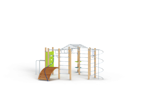 Спортивный комплекс оборудован рукоходом изогнутым, рукоходом с кольцами, шведскими стенками, брусьями изогнутыми, кольцам гимнастическими, трапом барабанов с перекладиной и канатом, шестом спиралью, перекладинами, альписнистскими стенками и круглыми фанерными столиками.