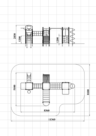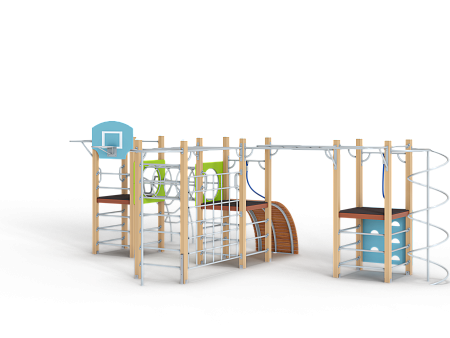 Спортивный комплекс состоит трёх башен, соединенных между собой металлическим переходом из колец и и металлическим рукоходом-сеткой. На первой башне установлены лиана, шведские стенки, перекладины, турник приставной, ручки вспомогательные и баскетбольный щит с кольцом. На второй башне установлены трап барабан с перекладиной и канатом, шведские стенки, и ручки вспомогательные. Вторая башня имеет продолжение в виде гимнастического комплекса в виде шведской стенки и шеста, соединенного с башней рукоходом. На третьей башне установлены альпинистская стенка с перекладиной и канатом, шведские стенки, шест спираль, перекладина и турник приставной.