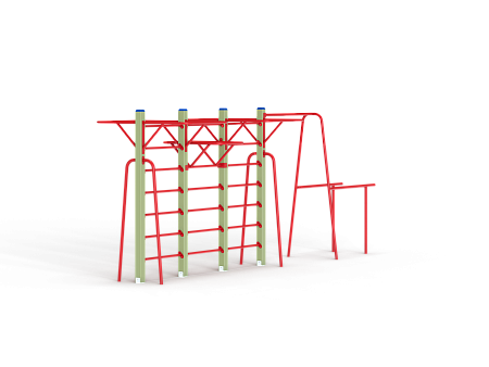 Спортивный комплекс состоит из каскада шведских стенок, турников и гимнастических брусьев.