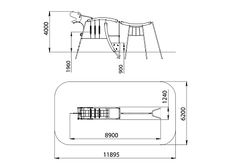 Универсальный комплекс состоит из гимнастического оборудования, пяти изогнутых деревянных стоек, лазов с отверстиями, стенок с камнями для лазания, декоративных элементов и площадки. Элементы комплекса скомпанованы в виде динозавра, передняя декоративная накладка имеет форму головы динозавра. Все металлические гимнастические элементы выполнены из стали с оцинкованным покрытием. Оцинковка металла производится методом электрохимической гальванизации. Деревянные стойки выполнены из тщательно отшлифованной древесины высочайшей прочности и окрашены высококачественным лаковым покрытием. Лазы с отверстиями выполнены из высококачественного пластика. Сетки изготовлены из многожильного армированного износостойкого каната. Площадка выполнена из экструдированного высокомолекулярного полиэтилена, декоративные элементы и стенка для камней выполнены из HPL пластика.