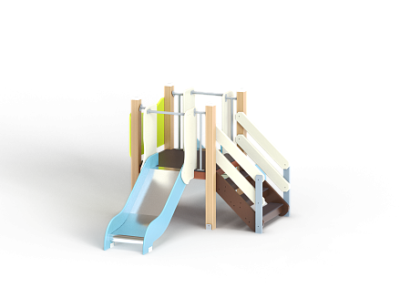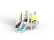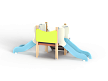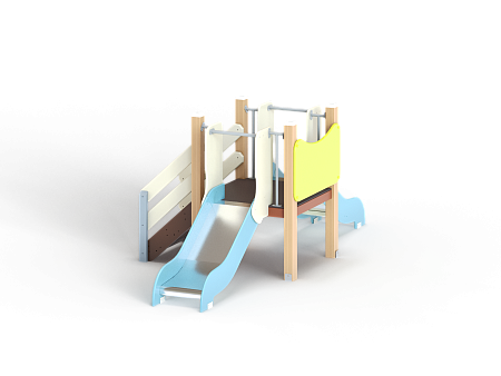 Комплекс состоит из башни с двумя горками с высотой ската 700 мм, лестницы и фанерного ограждения.