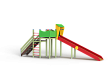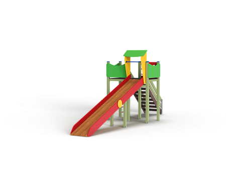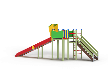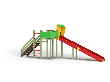 Комплекс состоит из башен с зимней горкой с высотой ската 1800 мм, лестницы, перекладин и фанерных ограждений.