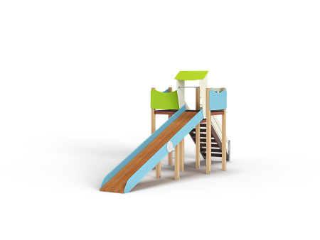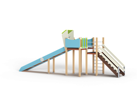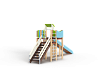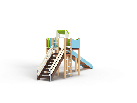 Комплекс состоит из башен с зимней горкой с высотой ската 1800 мм, лестницы, перекладин и фанерных ограждений.