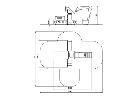 Комплекс состоит из каркаса с площадками, каркаса стрелы и ковша, горки, трапа и ограждений в виде деталей экскаватора. Каркасы выполнены из нержавеющего металла. Ограждения выполнены из HPL пластика. Площадки и трап выполнены из экструдированного высокомолекулярного полиэтилена. Скат горки выполнен из нержавеющей стали.