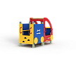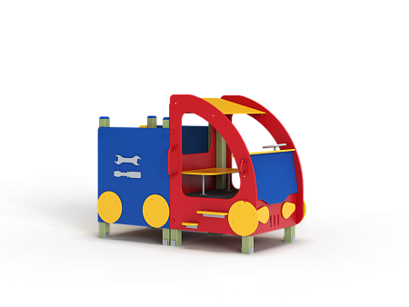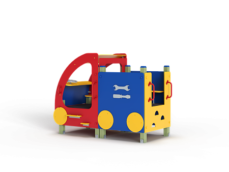 Машина выполнена из фанерных элементов в виде кабины и кузова. Кабина имеет вход с двух сторон, по две ступеньки и по две ручки с каждой стороны, вращающийся руль и сидение. Кузов - открытая площадка со входом в виде альпинистской стенки. На бортах кузова прикреплены декоративные элементы в виде слесарных инструментов.