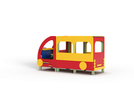 Автобус состоит из двух площадок в виде кабины и кузова с бортовыми фанерными ограждениями иммитирующих детали автобуса. Кабина имеет вход с двух сторон, по две ступеньки и по две ручки с каждой стороны, вращающийся руль и сидение. Кузов - площадка, имеющая один вход и скамейки внутри. У входа в кузов установлены три ступеньки и две ручки.