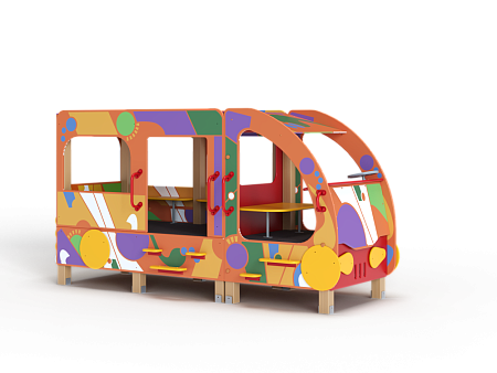 Автобус состоит из двух площадок в виде кабины и кузова с бортовыми фанерными ограждениями иммитирующих детали автобуса с художественным оформлением в стиле граффити. Кабина имеет вход с двух сторон, по две ступеньки и по две ручки с каждой стороны, вращающийся руль и сидение. Кузов - площадка, имеющая один вход и скамейки внутри. У входа в кузов установлены три ступеньки и две ручки.