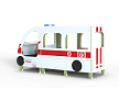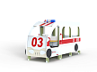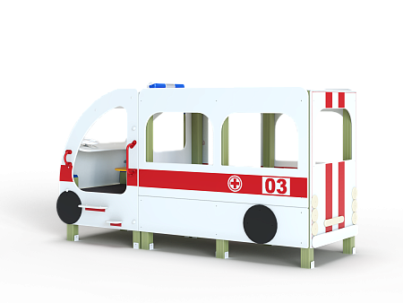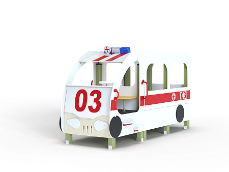 Автобус состоит из двух площадок в виде кабины и кузова с бортовыми фанерными ограждениями иммитирующих детали автобуса в цветовой гамме службы скорой помощи с художественным оформлением. Кабина имеет вход с двух сторон, по две ступеньки и по две ручки с каждой стороны, вращающийся руль и сидение. Кузов - площадка, имеющая один вход и скамейки внутри. У входа в кузов установлены три ступеньки и две ручки..