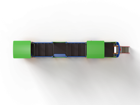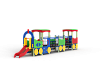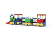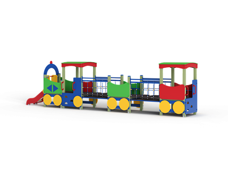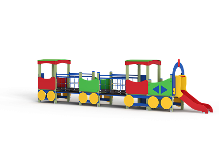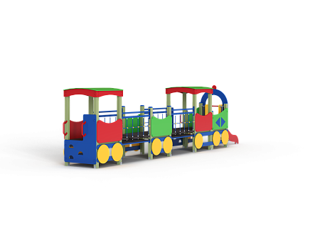 Паровозик состоит из кабины с крышей, котла с горкой и двух вагончиков. Кабина имеет вход в виде альпинистской стенки и две вспомогательные ручки, фанерное ограждение и крыша. Котел - открытая площадка с горкой, декоративной аркой и фанерным ограждением с художественным оформлением. Первый вагончик имеет два фанерных ограждения, второй вагончик имеет два фанерных ограждения, крышу, скамейку, вход в виде альпинистской стенки и две ручки. Вагончики соединены между собой и кабиной подвесными качающимися мостами. Снизу по бокам расположены декоративные колеса.