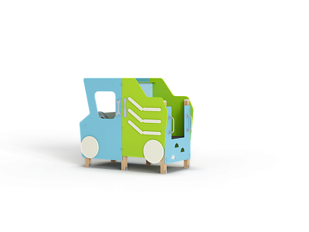 Самосвал состоит из крыши, ограждений в виде деталей кузова самосвала, лавочки, руля, ручек и декоративных фанерных элементов.