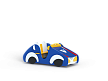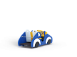 Машинка выполнена из фанерных деталей с раскраской в цветах службы ДПС, металлокаркаса, декоративных фанерных элементов и двух рулей.