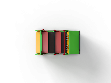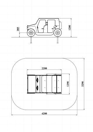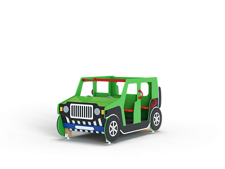 Вездеход состоит из площадки с фанерными элементами в виде кузовных деталей, ручек, вращающегося руля, металлических перекладин и сидений со спинками. За задней стенкой вездехода крепится фанерное сидение.