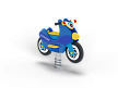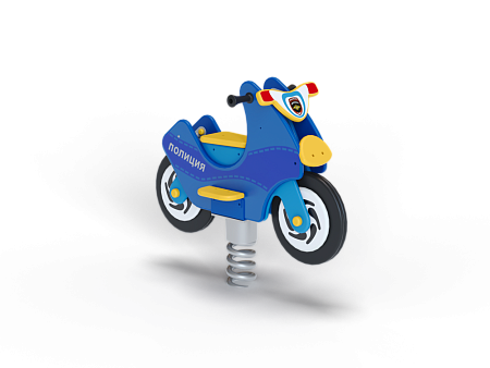 Качалка на пружине в форме мотоцикла изготовлена из фанерных элементов с ручной художественной росписью в стиле службы ДПС и металлических элементов с пружиной.