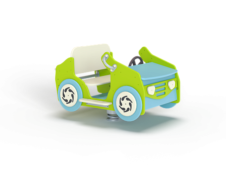 Качалка на пружине в форме кабриолета изготовлена из фанерных элементов, вращающегося руля и металлических элементов с пружиной.