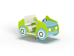 Качалка на пружине в форме кабриолета изготовлена из фанерных элементов, вращающегося руля и металлических элементов с пружиной.