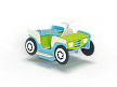 Качалка на пружине в форме квадроцикла изготовлена из фанерных элементов, металлического руля и металлических элементов с пружиной.