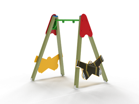Качели состоят из четырех деревянных столбов, крепежных фанерных накладок две из которых в форме перекрещивающихся стволов пушек с художественным оформлением и перекладины под один подвес.