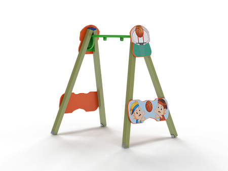 Качели состоят из четырех деревянных столбов, крепежных фанерных накладок в баскетбольном стиле с художественным оформлением и перекладины под один подвес.