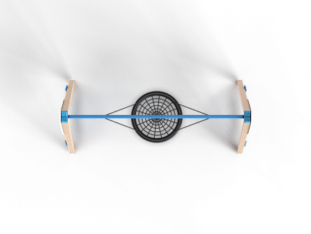 Качели состоят из четырех деревянных столбов, крепежных фанерных накладок в цветовой гамме службы ДПС и перекладины с прорезиненым подвесом из полипропиленового каната, сплетенного в виде гнезда.