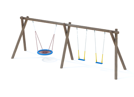 Качели двойные для подвеса гнездо и двух сидений выполнены из восьми брёвен. Брёвна выполнены из лиственницы, имеют естественную природную форму, тщательно отшлифованы и обладают высочайшей прочностью. Брёвна покрыты в три слоя специальной пропиткой финского производства, содержащую антисептики и обеспечивающую ультрафиолетовую защиту от солнечного воздействия. Сетка подвеса гнездо изготовлена из многожильного армированного износостойкого каната.
