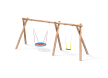 Качели двойные для подвеса гнездо и двух сидений выполнены из восьми брёвен. Брёвна выполнены из лиственницы, имеют естественную природную форму, тщательно отшлифованы и обладают высочайшей прочностью. Брёвна покрыты в три слоя специальной пропиткой финского производства, содержащую антисептики и обеспечивающую ультрафиолетовую защиту от солнечного воздействия. Сетка подвеса гнездо изготовлена из многожильного армированного износостойкого каната.