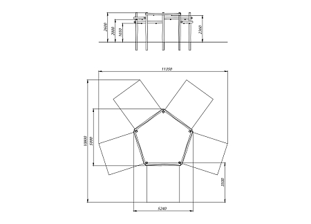 Рама качелей для пяти сидений выполнена из десяти бревен обвязанных в виде пятиугольника.