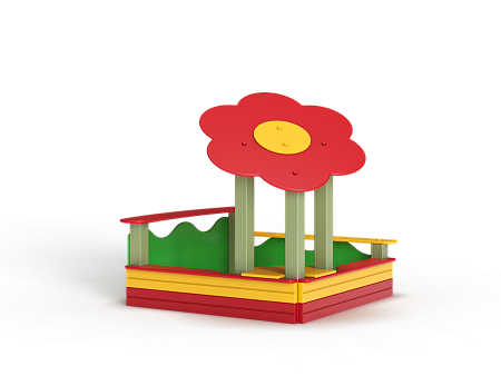 Песочница выполнена из бруса, фанерных стенок, опорных столбов, фанерных накладок-сидений и фанерного навеса в форме ромашки.