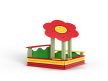 Песочница выполнена из бруса, фанерных стенок, опорных столбов, фанерных накладок-сидений и фанерного навеса в форме ромашки.