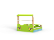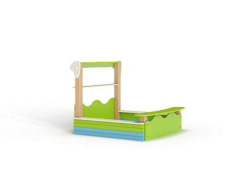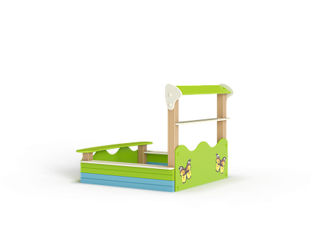 Песочница выполнена из бруса, фанерных стенок с художественным оформлением, опорных столбов, фанерных накладок-сидений и фанерного спойлера.