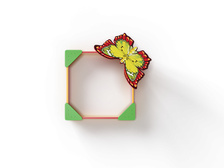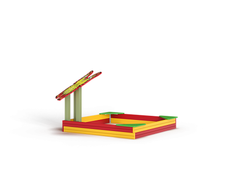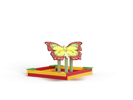 Песочница выполнена из бруса и угловых фанерных накладок, скрепленных между собой при помощи металлических закладных стоек. В углу песочницы, внутри, установлен фанерный навес в форме бабочки с художественным оформлением.