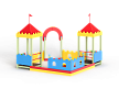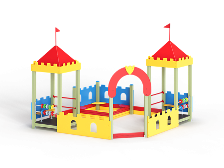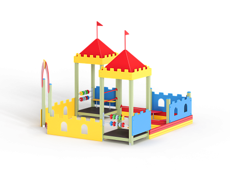 Песочный дворик – модульная конструкция из игровых и развивающих элементов с кремлевской тематикой. Конструкция оборудована двумя башнями беседками, одной аркой, песочницей, ограждением по периметру из деревянного бруса и фанеры. Башни беседки оборудованы крышами, металлическими перекладинами, фанерными ограждениями, детскими счетами с пластиковыми бубликами и сидениями. Песочница с четырьмя фанерными накладками и декоративным фанерным ограждением в наружном углу в форме стен кремля.