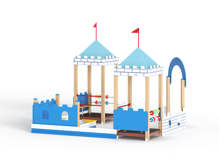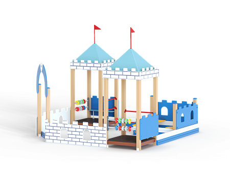 Песочный дворик – модульная конструкция из игровых и развивающих элементов с кремлевской тематикой и окраской в цветах службы ДПС. Конструкция оборудована двумя башнями беседками, одной аркой, песочницей, ограждением по периметру из деревянного бруса и фанеры с художественным оформлением. Башни беседки оборудованы крышами, металлическими перекладинами, фанерным ограждением, детскими счетами с пластиковыми бубликами и сидением. Песочница с четырьмя фанерными накладками и декоративным фанерным ограждением в наружном углу в форме стен кремля.