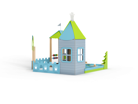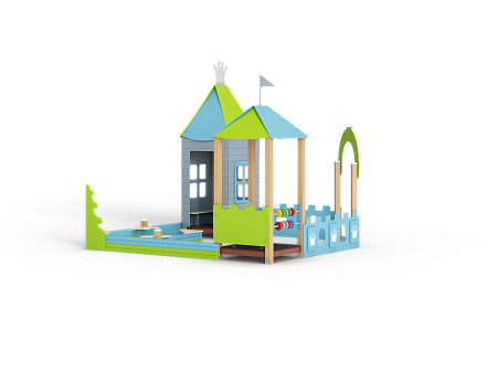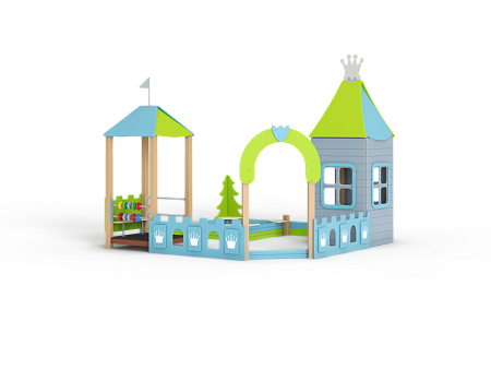 Песочный дворик Белоснежка - модульная конструкция из игровых и развивающих элементов с тематикой сказки «Белоснежка. Конструкция оборудована двумя башнями - беседками, одной аркой, песочницей и ограждением по периметру из деревянного бруса и фанеры с декоративными накладками с художественным оформлением. Башни оборудованы крышей, фанерным ограждением, металлическими перекладинами и детскими счетами с пластиковыми бубликами. Арка выполнена из фанеры с декоративными фанерными элементами в форме гномиков с художественным оформлением. Песочница с четырьмя фанерными накладками и декоративным фанерным ограждением в наружном углу в форме ёлки.