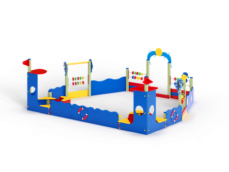 Песочный дворик – модульная конструкция из игровых и развивающих элементов с морской тематикой. Конструкция оборудована двумя песочницами, одной аркой и ограждением из бруса и фанеры по периметру. Песочницы оборудованы навесами, декоративными фанерными флажками, ограждениями, два из которых имеют круглый вырез в виде иллюминатора и фанерные накладки. По периметру дворика расположены детские счеты с пластиковыми бубликами, сидения, арка в виде дельфинов с декоративным соединяющим элементом из фанеры в виде мяча, спойлеры с накладками в виде морских коньков с художественным оформлением.