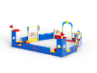 Песочный дворик – модульная конструкция из игровых и развивающих элементов с морской тематикой. Конструкция оборудована двумя песочницами, одной аркой и ограждением из бруса и фанеры по периметру. Песочницы оборудованы навесами, декоративными фанерными флажками, ограждениями, два из которых имеют круглый вырез в виде иллюминатора и фанерные накладки. По периметру дворика расположены детские счеты с пластиковыми бубликами, сидения, арка в виде дельфинов с декоративным соединяющим элементом из фанеры в виде мяча, спойлеры с накладками в виде морских коньков с художественным оформлением.