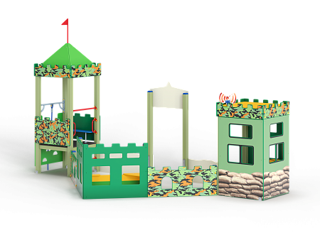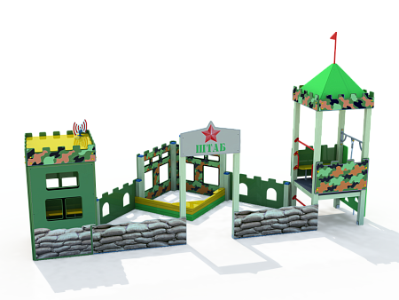 Песочный дворик – модульная конструкция из игровых и развивающих элементов с художественным оформлением в военной тематике. Состоит из башни-вышки, домика-штаба и песочницы. На башне-вышке установлена крыша, фанерные ограждения, альпинистская стенка, перекладины, перекладина с канатом и ручки вспомогательные. Домик-штаб состоит из башни с фанерными стенами и окнами. Крыша домика имеет декоративный элемент в виде антенны. Внутри домика расположена скамейки на металлических ножках и стол. Периметр песочницы огорожен деревянным брусом и фанерным ограждением, доступ в периметр осуществлен в виде арочного входа.