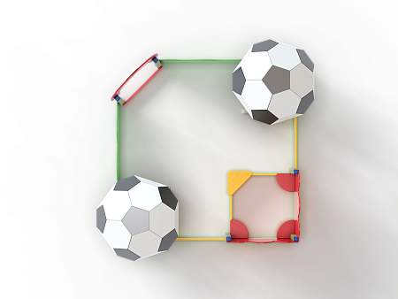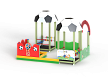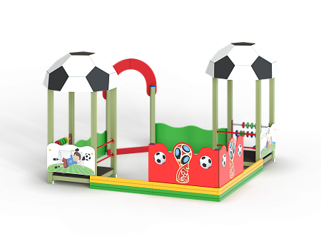 Песочный дворик – модульная конструкция из игровых и развивающих элементов с футбольной тематикой. Конструкция оборудована двумя башнями беседками, одной аркой, песочницей, ограждением по периметру из деревянного бруса и фанеры с художественным оформлением. Башни беседки оборудованы крышами в виде половинок футбольного мяча, металлическими перекладинами, фанерным ограждением, детскими счетами с пластиковыми бубликами и сидением. Песочница с четырьмя фанерными накладками и декоративным фанерным ограждением в наружном углу.