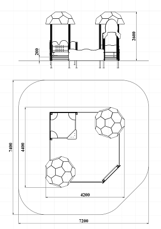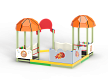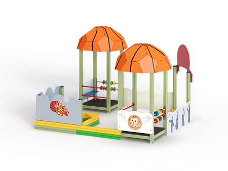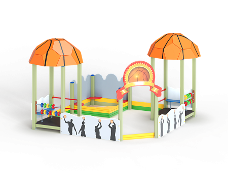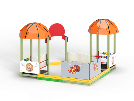 Песочный дворик – модульная конструкция из игровых и развивающих элементов с художественным оформлением в баскетбольной тематике. Конструкция оборудована двумя башнями беседками, одной аркой, песочницей, ограждением по периметру из деревянного бруса и фанеры с художественным оформлением. Башни беседки оборудованы крышами в виде половинок баскетбольного мяча, металлическими перекладинами, фанерным ограждением, детскими счетами с пластиковыми бубликами и сидением. Песочница с четырьмя фанерными накладками и декоративным фанерным ограждением в наружном углу.