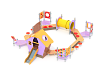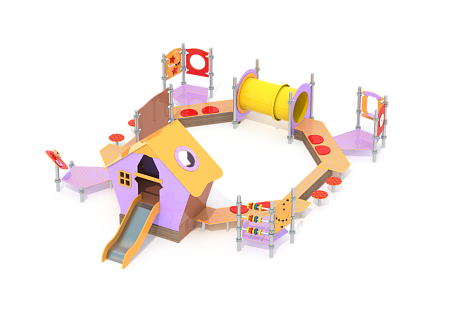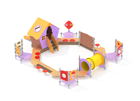 По перимитру восьмигранной песочницы расположены - борта песочницы, крытый домик с горкой и лестницей, четыре площадки с ограждениями с различными игровыми элементами , доска для рисования, табуреты, туннельный лаз из высокопрочного пластика и металлические стойки. Ограждения и накладки изготовлены из HPL пластика. Металлические элементы выполнены из нержавеющей стали.