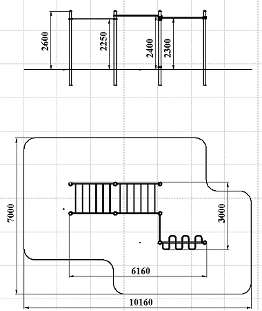 Воркаут состоит из восьми несущих столбов, рукохода-змейки, шведской стенки и двух рукоходов с зажимными хомутами.