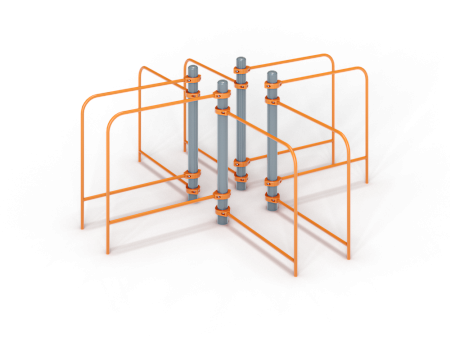 Воркаут состоит из четырех несущих столбов и восьми брусьев с зажимными хомутами.
