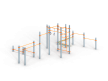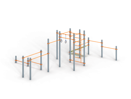 Воркаут состоит из семнадцати несущих столбов, четырнадцати перекладин, перекладины с гимнастическими кольцами, шведской стенки и наклонной скамьи из бруса с зажимными хомутами.